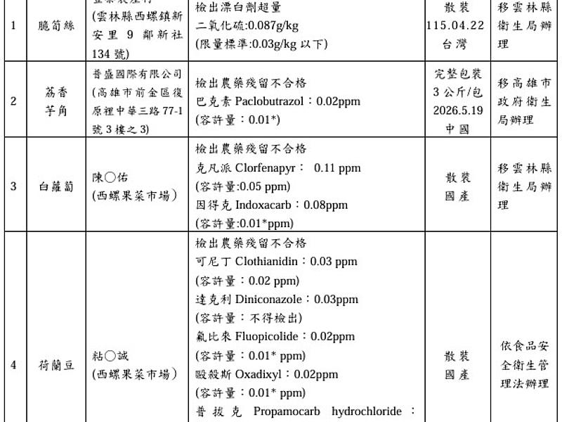 本次有多家食品業者進口之農產品產品檢出農藥殘留含量不符...